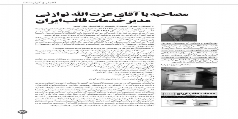 احتراما به استحضار می رساند متن مصاحبه جناب آقای عزت الله نوارنی مدیریت عامل خدمات قالب ایران در خصوص محصول جدید خدمات قالب ایران چاپ شده در نشریه جامعه قالبسازان در شماره تیرماه 1395 به حضورتان تقدیم میشود. با تشکر روابط عمومی خدمات قالب ایران